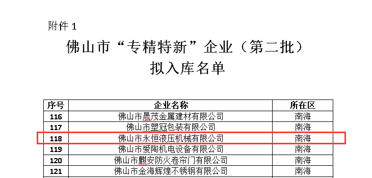 永恒液壓憑借廣闊的市場空間、產(chǎn)品用途的專門性、生產(chǎn)工藝的專業(yè)性及自主技術(shù)的專有性,成功入庫佛山市“專精特新”企業(yè)。